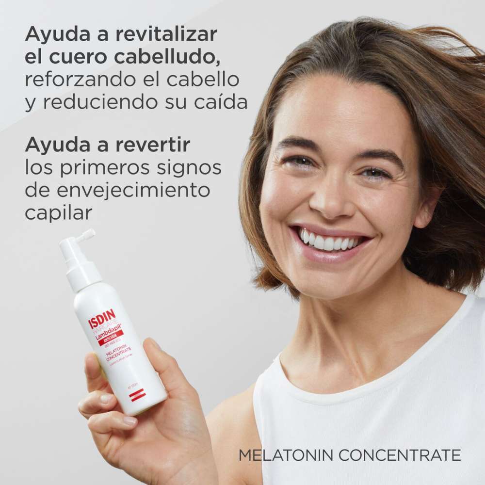 Cuida tu cabello mientras duermes con Lambdapil® Melatonin Concentrate, la loción con melatonina que actúa sobre el cuero cabelludo ayudando a reforzar el cabello y reducir su caída. Contribuye a revertir los primeros signos del envejecimiento capilar ayudando a mejorar la densidad y volumen del cabello
