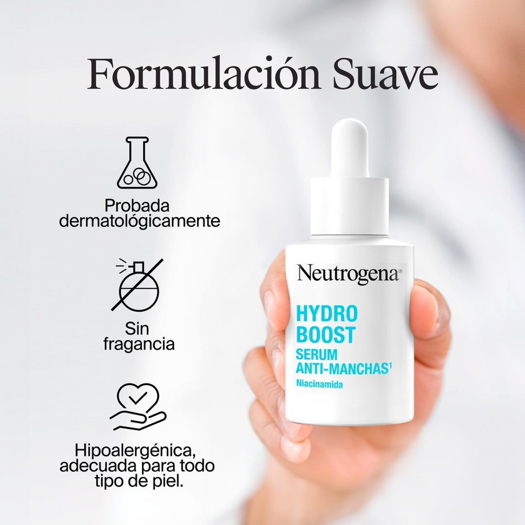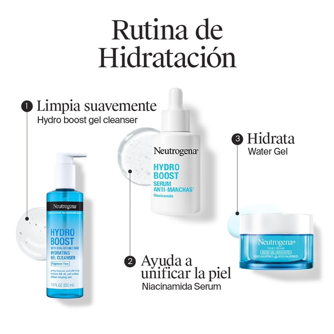 Neutrogena® Hydro Boost Serum Facial Anti-manchas Mantén una piel suave y renovada con nuestro serum con 10 % de niacinamida, ácido hialurónico y neoglucosamina. Este poderoso serum hidratante de acción múltiple exfolia para refinar el aspecto de los poros y mejorar el aspecto de la piel con un tono más uniforme. Además, ayuda a fortalecer la barrera de la piel mientras mejora visiblemente la textura de la piel opaca e irregular.